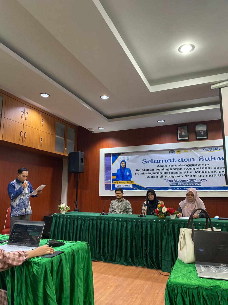 Medan, 28 September 2024 – Prodi Bimbingan dan Konseling Fakultas Keguruan dan Ilmu Pendidikan (FKIP) Universitas Muhammadiyah Sumatera Utara (UMSU) menggelar pelatihan peningkatan kompetensi dosen dalam pembelajaran berbasis alur merdeka pada Sabtu (28/9/2024). Kegiatan yang berlangsung dari pukul 09.00 hingga 16.00 WIB di Aula FKIP Lantai 2 ini khusus diperuntukkan bagi dosen Program Studi Bimbingan dan Konseling. Pelatihan ini dibuka secara resmi oleh Dekan Fakultas Keguruan dan Ilmu Pendidikan Universitas Muhammadiyah Sumatera Utara, yang dalam sambutannya menekankan pentingnya adaptasi metode pembelajaran sesuai dengan perkembangan zaman dan tuntutan kurikulum merdeka.”Pelatihan ini merupakan bagian dari komitmen BK FKIP UMSU untuk terus meningkatkan kualitas pembelajaran dan kompetensi dosen-dosen BK, khususnya dalam mengimplementasikan konsep merdeka belajar yang telah digagas oleh Kementerian Pendidikan,” ujar Dekan dalam pembukaan acara.